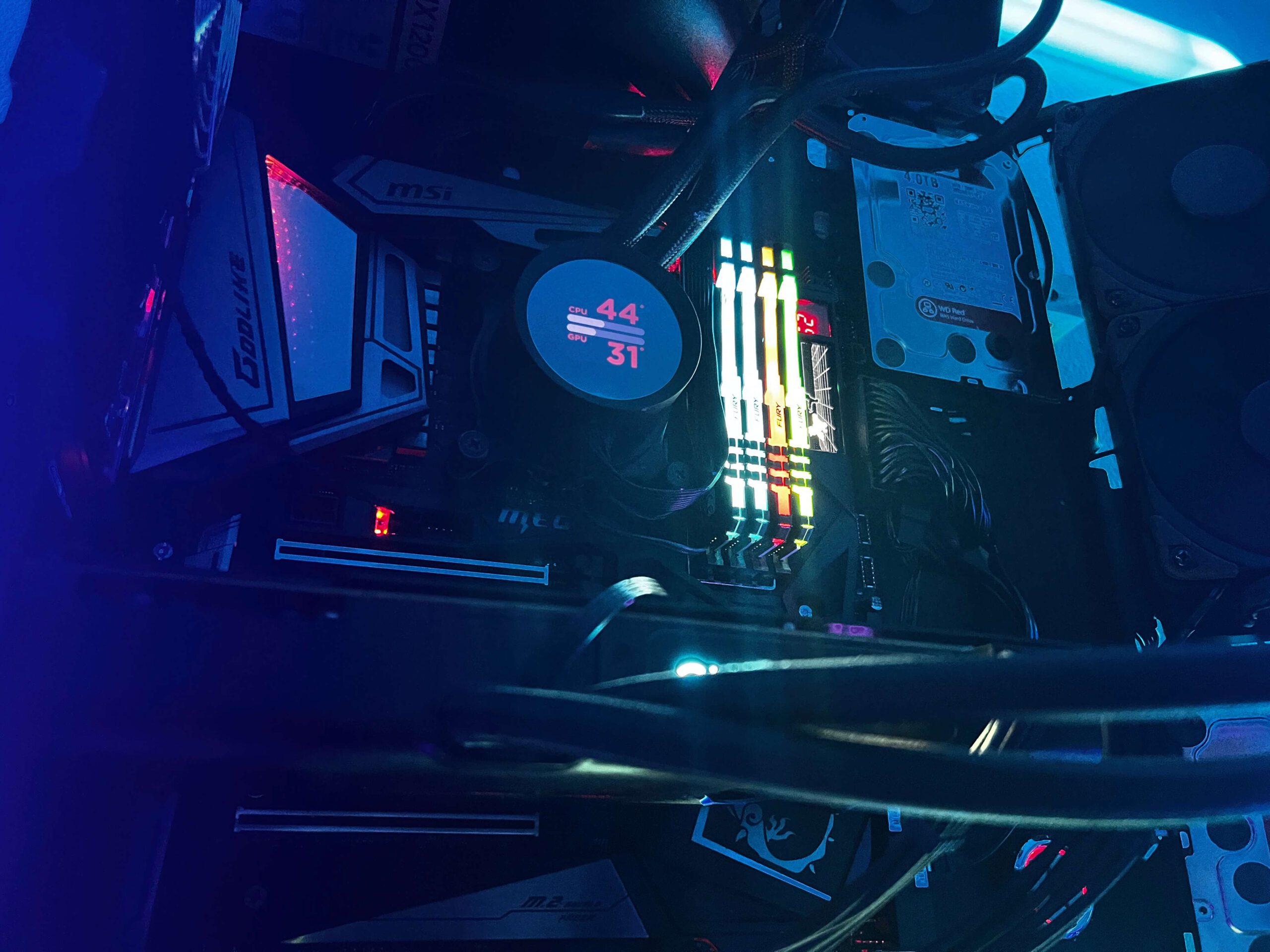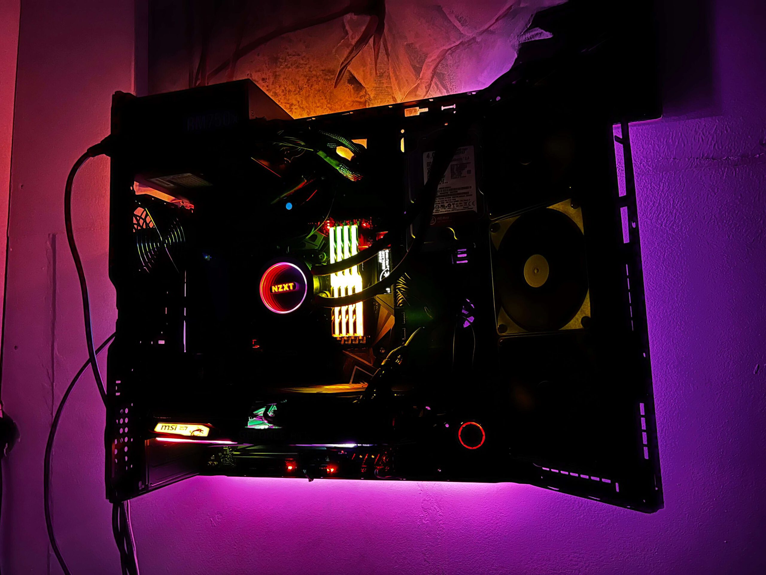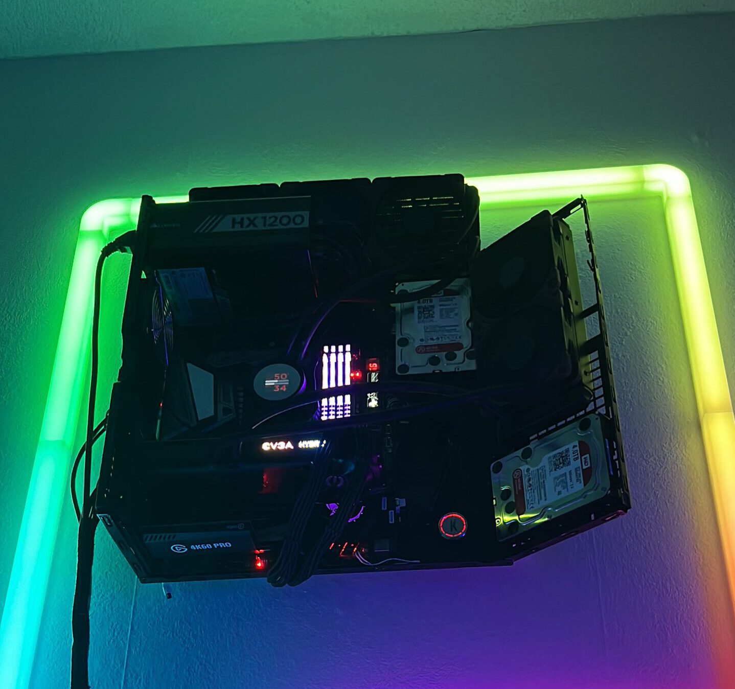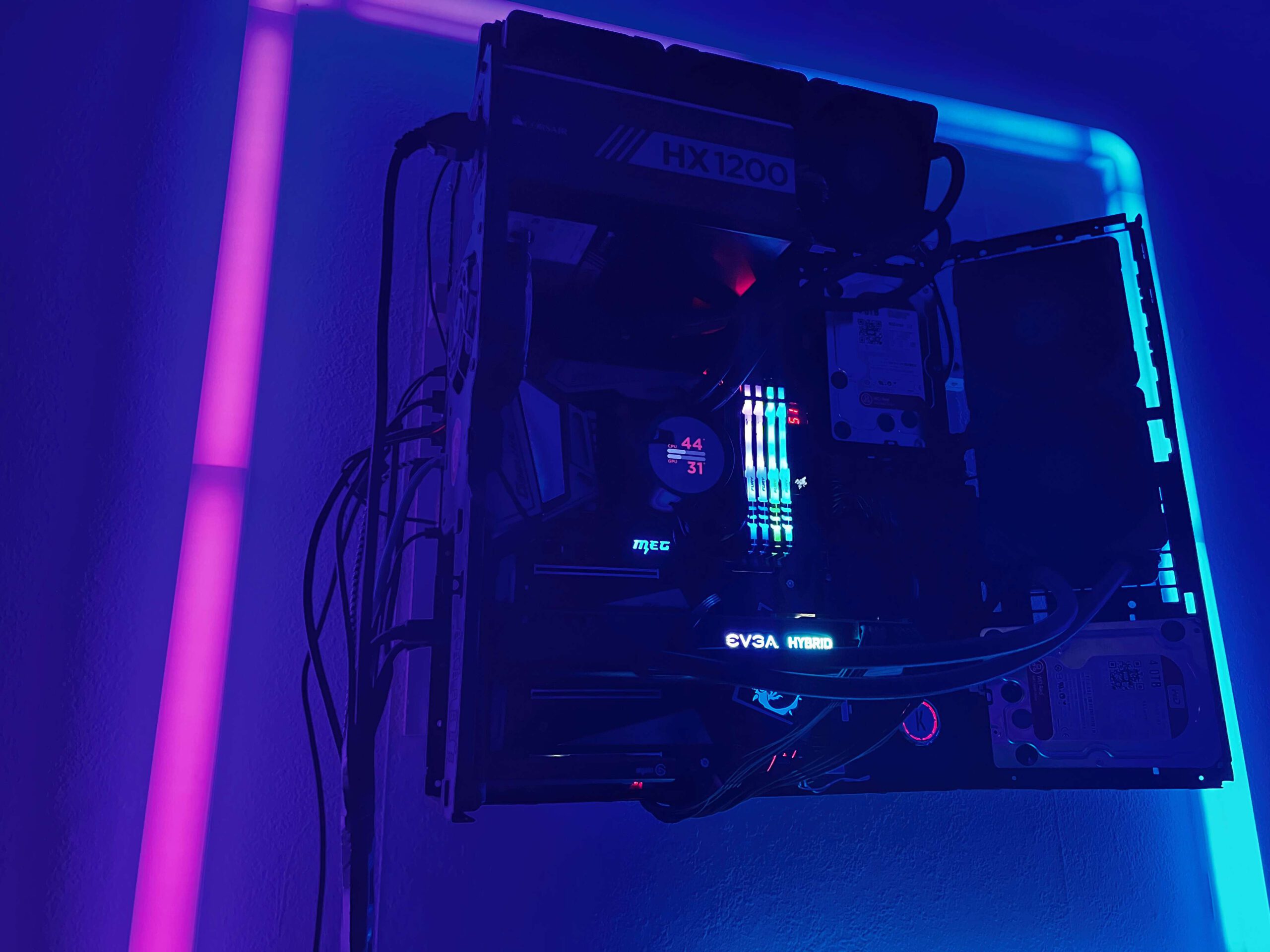 Een volledig open pc waar de airflow ging via de open lucht. Wij hebben deze pc maximaal overclockt zonder dat er echt problemen waren. In deze pc zat een I 9900K met een 3080 die allebei watergekoeld waren waardoor de 3080 de ti bios kon gebruiken en deze hierdoor makkelijk met de meest high end pc’s mee kon doen ondanks dat hij niet de beste en nieuwste componenten heeft.
